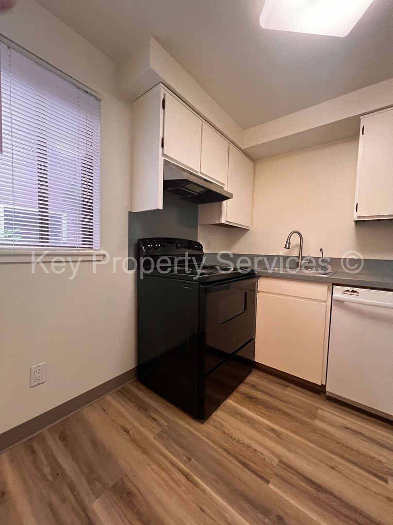 The apartment features 2 bedrooms, 1.5 bathrooms, and an open floor plan with all kitchen appliances included, a spacious living room with large windows, laminate flooring, and a slider door to the cozy backyard patio space. The unit comes with one covered parking space, a large storage room, and a washer/dryer included in the unit. Wall Heat/No AC (only wall AC in one bedroom).