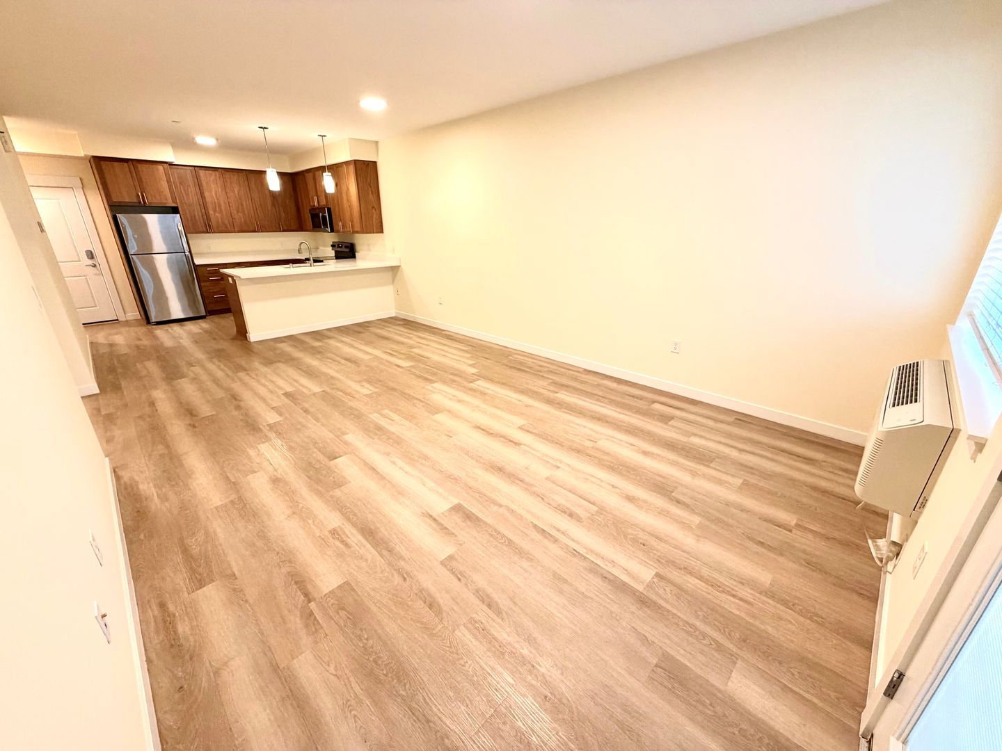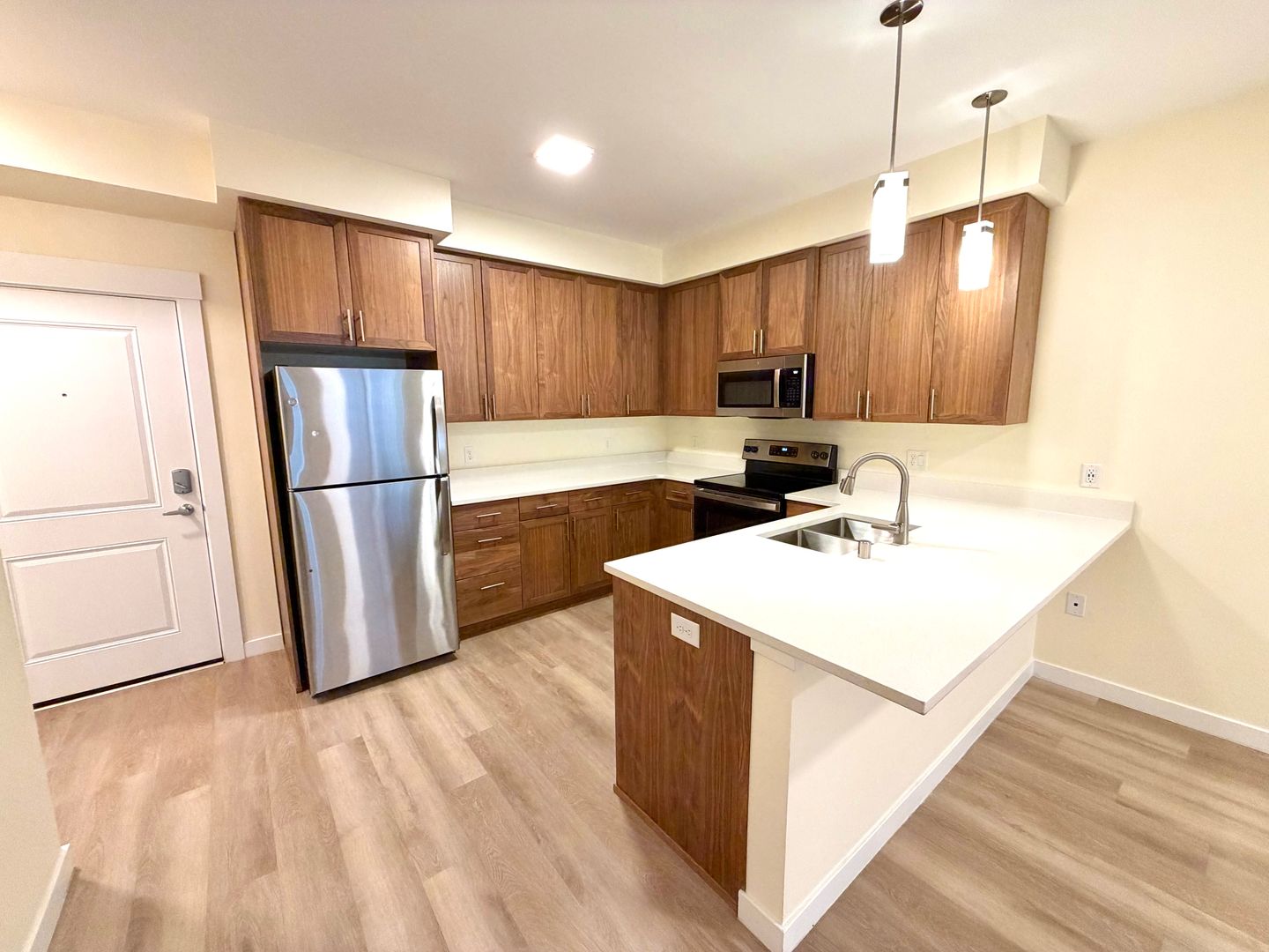 Apartment Features - Spacious layouts with tall ceilings, keyless entry system, high-end kitchens with warm walnut cabinets, quartz countertops and pendant lights, personal climate control with A/C, private deck and front-load washer and dryer in every unit.